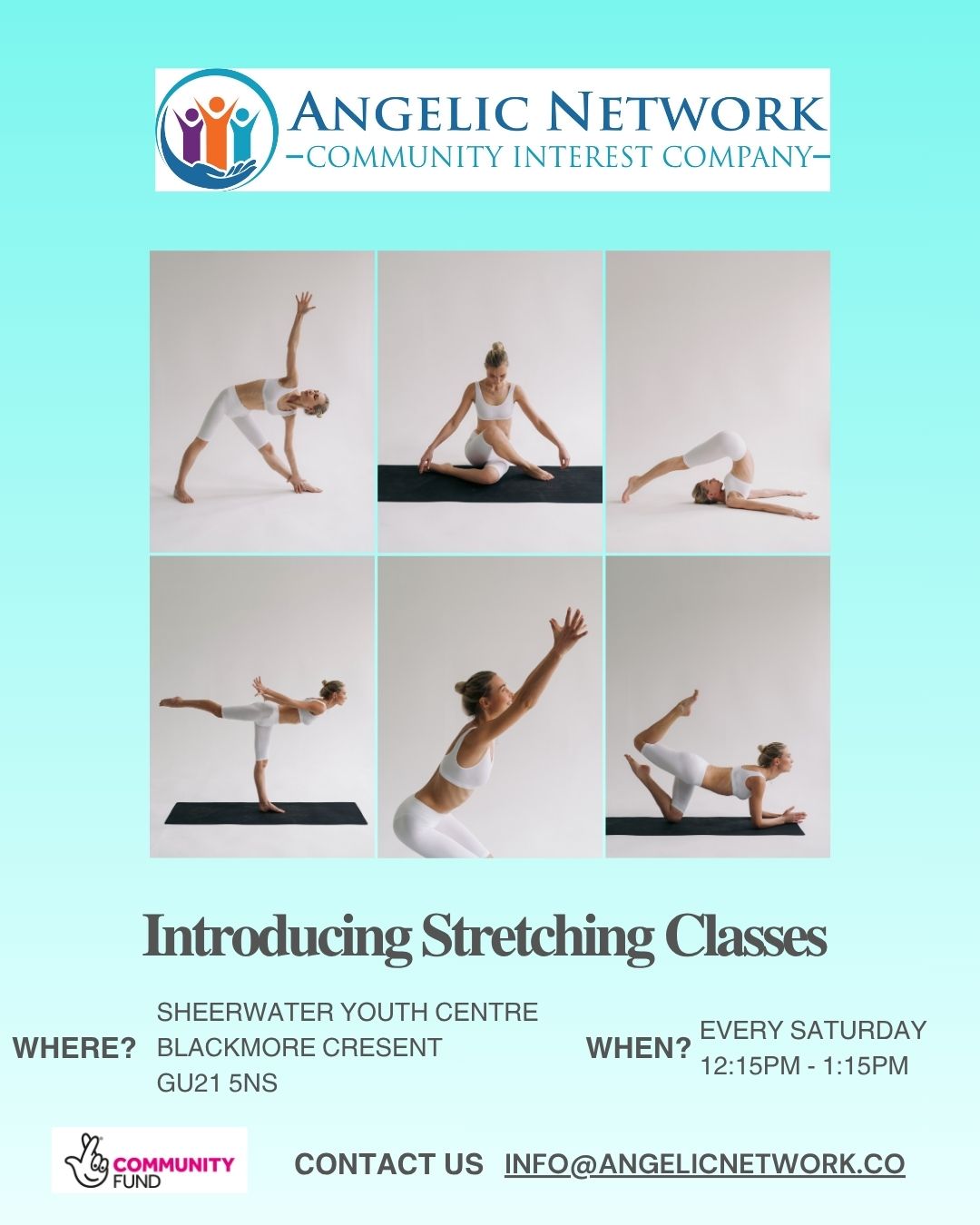 Sheerwater Youth Centre Blackmore Cresent, Woking, SurreyAngelic Network is excited to introduce weekly stretching classes, open to individuals of all abilities, taking place every Saturday. These sessions are designed to support members in improving their physical …